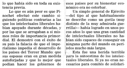 “La gente debe estar de acuerdo en diferir sobre los Héroes. Yo admiro enormemente Chile y su gente, y me preocupé cuando mi amigo Salvador Allende se hizo presidente y abrió el país a las hordas radicales armados de todas partes del mundo. El resultado fue la mayor inflación del mundo, una violencia generalizada y la amenaza de una guerra civil. Así que aplaudí la toma del poder por parte del General Pinochet, en consonancia con los deseos del Parlamento, y aún más su éxito a la hora de revitalizar la economía y en convertirla en la más sólida de Latinoamérica. Pero al evitar la transformación de Chile en un satélite comunista, el general se granjeó el furioso odio de la Unión Soviética , cuya maquinaria propagandística le demonizó con éxito entre los intelectualoides de todo el mundo. Fue el último triunfo del KGB antes de desvanecerse en la papelera de la historia. PERO PINOCHET SIGUE SIENDO UN HÉROE PARA MÍ PORQUE CONOZCO LOS HECHOS".